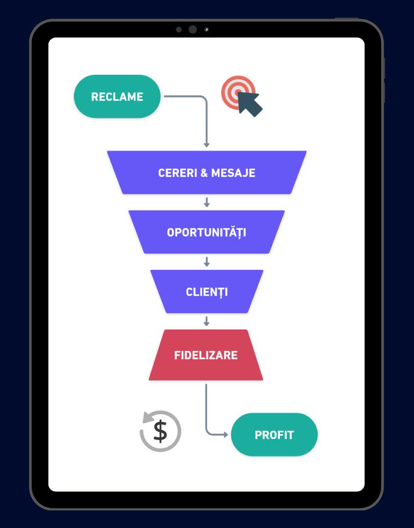 Reclame → Mesaje & Cereri → Oportunități / Consultații → Vânzare → Retenție.